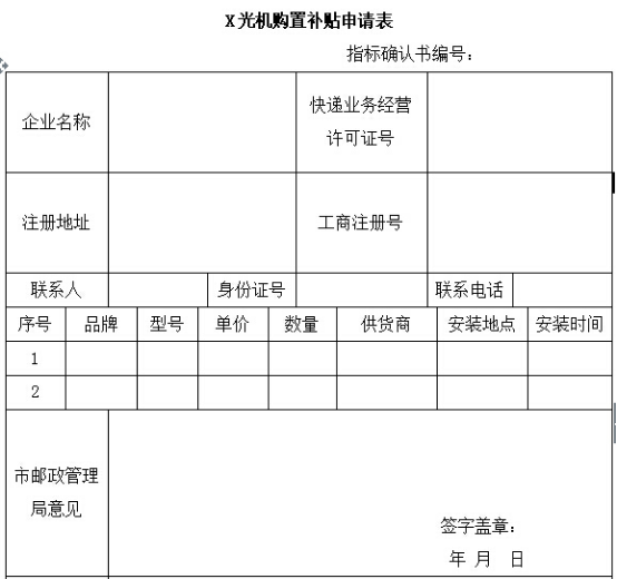 自2016年3月郵政總局實行三個100%(100%先驗視后封箱、100%寄遞實名制、100%X光機安檢)以來,各地政府為鼓勵快遞業購置創藝龍快遞安檢機,相繼對快遞業進行了補貼行為!可能很多快遞業還不知道怎么拿到這筆補貼資金,今天小編就來告訴大家該怎么申請,首先要填寫購置快遞安檢機補貼申請表:安檢機政府補助申請表(具體有無補助,要看各地情況,自己可以向當地政府咨詢)