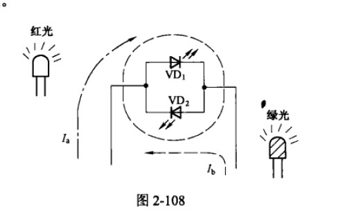 1、雙色發光二極管。它是將兩種發光顏色(常見的為紅色和綠色)的發光二極管管芯反向并聯后封裝在一起,如圖2-108所示。當工作電壓為左正右負時,電流Ia通過管芯VD1使其發紅光;當工作電壓為左負右正時,電流Ib通過管芯VD2使其發綠光。