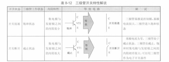 三極管同二極管一樣,也可以作為電子開關(guān)器件,構(gòu)成電子開關(guān)電路。當(dāng)三極管用于開關(guān)電路中時(shí),三極管工作在截止、飽和兩個(gè)狀態(tài),詳細(xì)情況如表8-12所示。