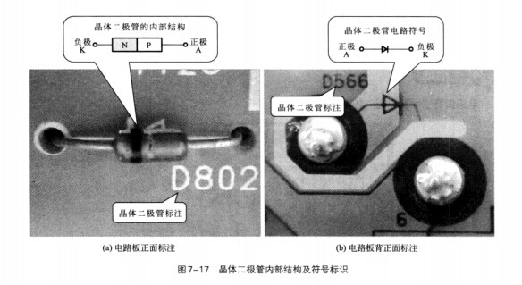 可以看到,D802和D566即為晶體二極管。由于晶體二極管有極性的區(qū)分,對(duì)于小功率晶體二極管來說,如圖7-17(a)所示,在晶體二極管的表面,靠近左端的引腳有一個(gè)色環(huán)標(biāo)注,這表明該端引腳為晶體二極管的K極(負(fù)極),另一端即為晶體二極管的正極。此外,在電路板上,有時(shí)也可以通過晶體二極管的電路符號(hào)標(biāo)注來判別晶體二極管及其引腳極性。如圖7-17(b)所示,在電路板的背面,可以通過"D566"來判別這是一個(gè)晶體二極管,而通過